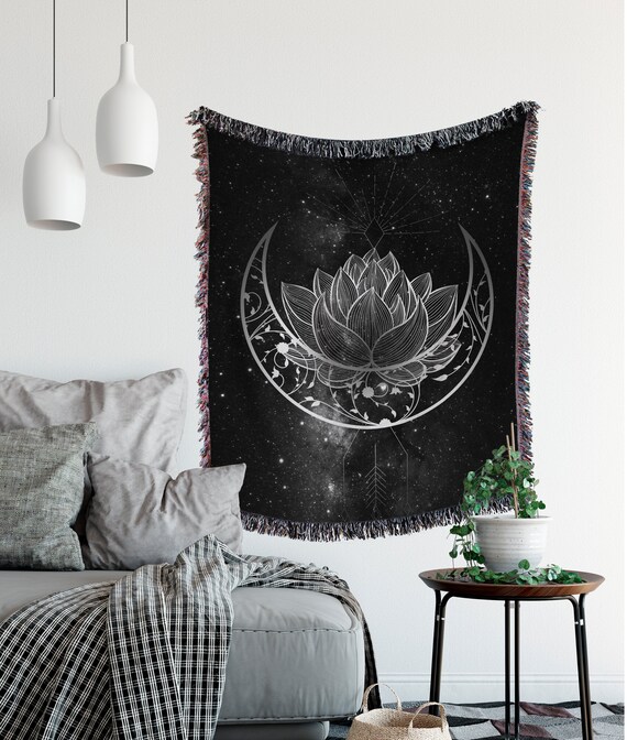 Jacquard Woven - Lotus and MOON Woven - Black and Gray - Woven Tapestry - Blanket -Cotton Meditation Yoga Grunge Hippie by DesignBohemian