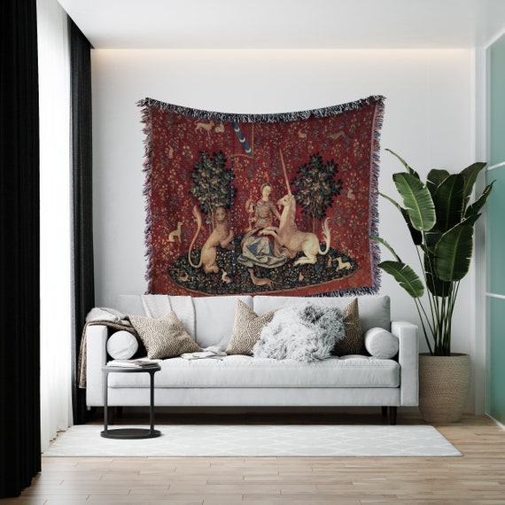 Woven Cotton Tapestry Woven Throw Blanket - Lady With Unicorn Sight Blanket by Printagrams