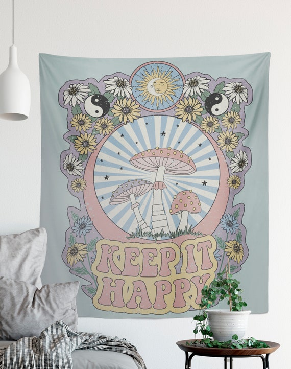 Hippy Tapestry - Pink Hippy Tapestry - Keep it Happy - Wall Hanging Meditation Yoga Grunge Hippie - Mushroom Tapestry by DesignBohemian
