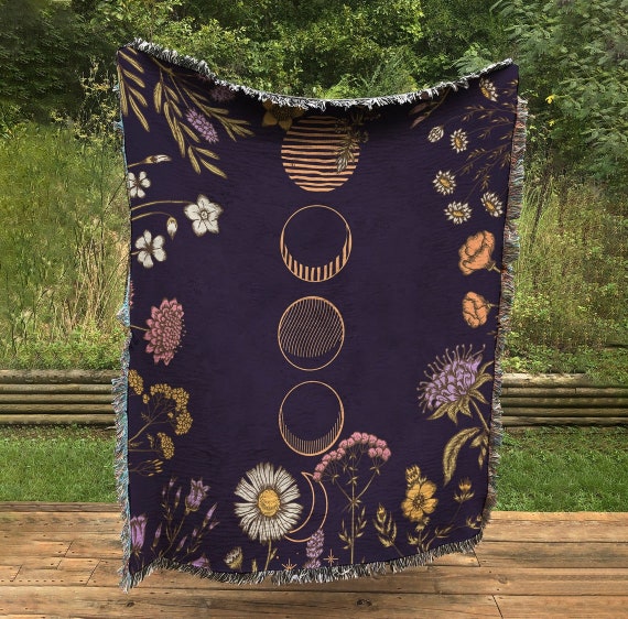 Jacquard Woven - Woven Moon Phase Tapestry - in Purple with Flowers - Cotton Throw - Meditation Yoga Grunge Hippie by DesignBohemian