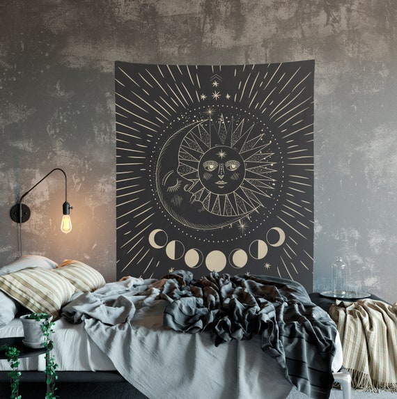 Moon Sun Space Geometry Black and Gold Tapestry Wall Hanging Meditation Yoga Hippie by DesignBohemian