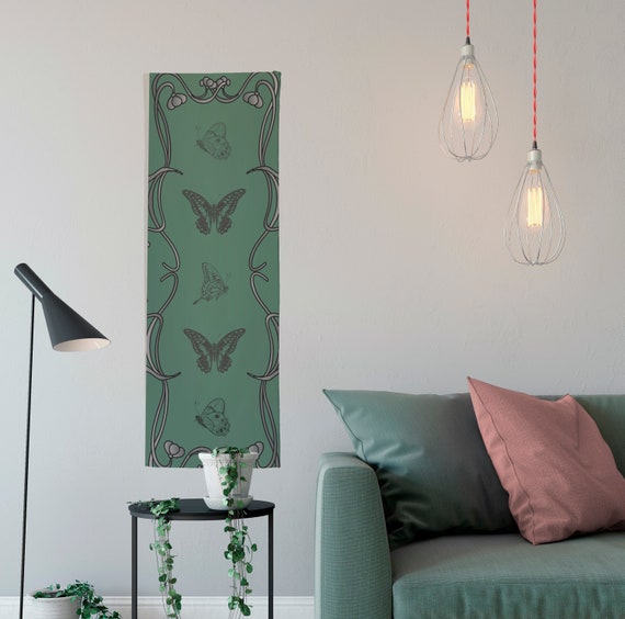 Art Nouveau Butterfly Tapestry Green Long Wall Tapestry Alchemy Hippie Wall Hanging Cotton Mucha Skinny by DesignBohemian