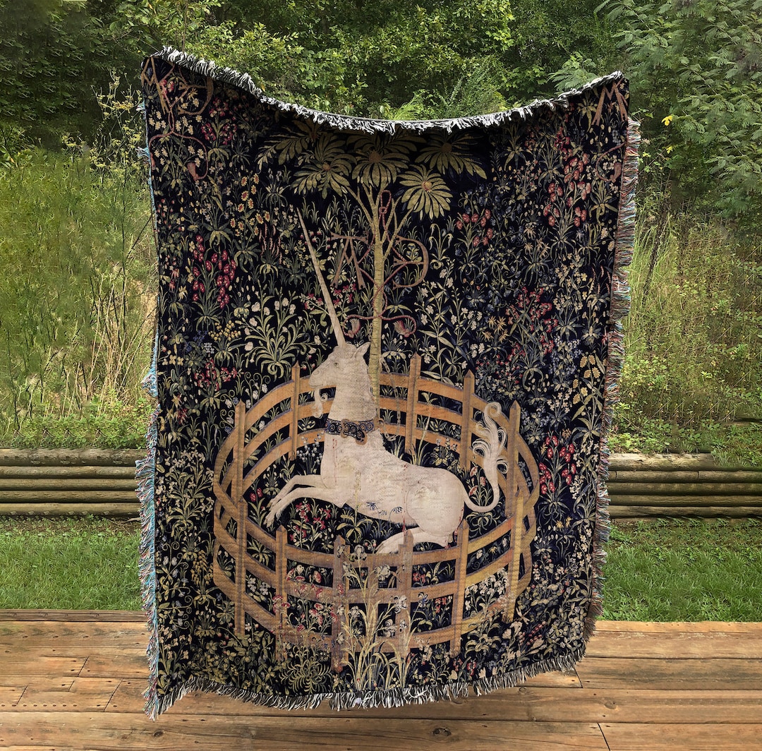 118.00 USD The Unicorn in Captivity The seven individual hangings known as "The Unicorn Tapestries," are among the most beautiful and complex works of art from the late Middle Ages that survive. Luxuriously woven in fine wool and silk with silver and gilded threads, the tapestries vividly depict scenes associated with a hunt for the elusive, magical unicorn. "The Unicorn in Captivity" may have been created as a single image rather than part of a series. In this instance, the unicorn probably represents the beloved tamed. He is tethered to a tree and constrained by a fence, but the chain is not secure and the fence is low enough to leap over: The unicorn could escape if he wished. Clearly, however, his confinement is a happy one, to which the ripe, seed-laden pomegranates in the tree—a medieval symbol of fertility and marriage—testify. The red stains on his flank do not appear to be blood, as there are no visible wounds like those in the hunting series; rather, they represent juice dripping from bursting pomegranates above. Many of the other plants represented here, such as wild orchid, bistort, and thistle, echo this theme of marriage and procreation: they were acclaimed in the Middle Ages as fertility aids for both men and women. Everything is customizable. If you need a different color just ask. All Measurements are in inches. 50 x 60 inch Woven Cotton Blanket - Medieval Unicorn Tapestry Made from 100% cotton loom pattern tapestry or blanket. Machine wash in cold water using mild detergent and gentle cycle only. Do not bleach or tumble dry. Packaged in a protective box. These Woven Blankets can also be hung as a Tapestry on your wall by using command strips. Final product may vary in color or detail from mock-up due to woven process. The fringe on the outside of Blankets are alternating white and black strands. If you would like a different graphic on your tapestry, contact me for a custom listing! ***Please contact me to set up a custom order if you need an item delivered faster*** PRINTED AND SENT FROM THE USA Images on mockups may look different than the final product due to the weaving process. ***Please double check the address you have on file with Etsy before placing your order.***