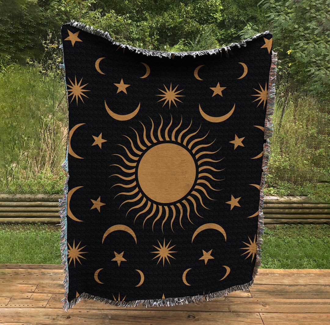 Jacquard Woven - Woven Sun and Moon Blanket in Black and Gold - with Flowers Cotton Woven - Meditation Yoga Grunge Hippie by DesignBohemian