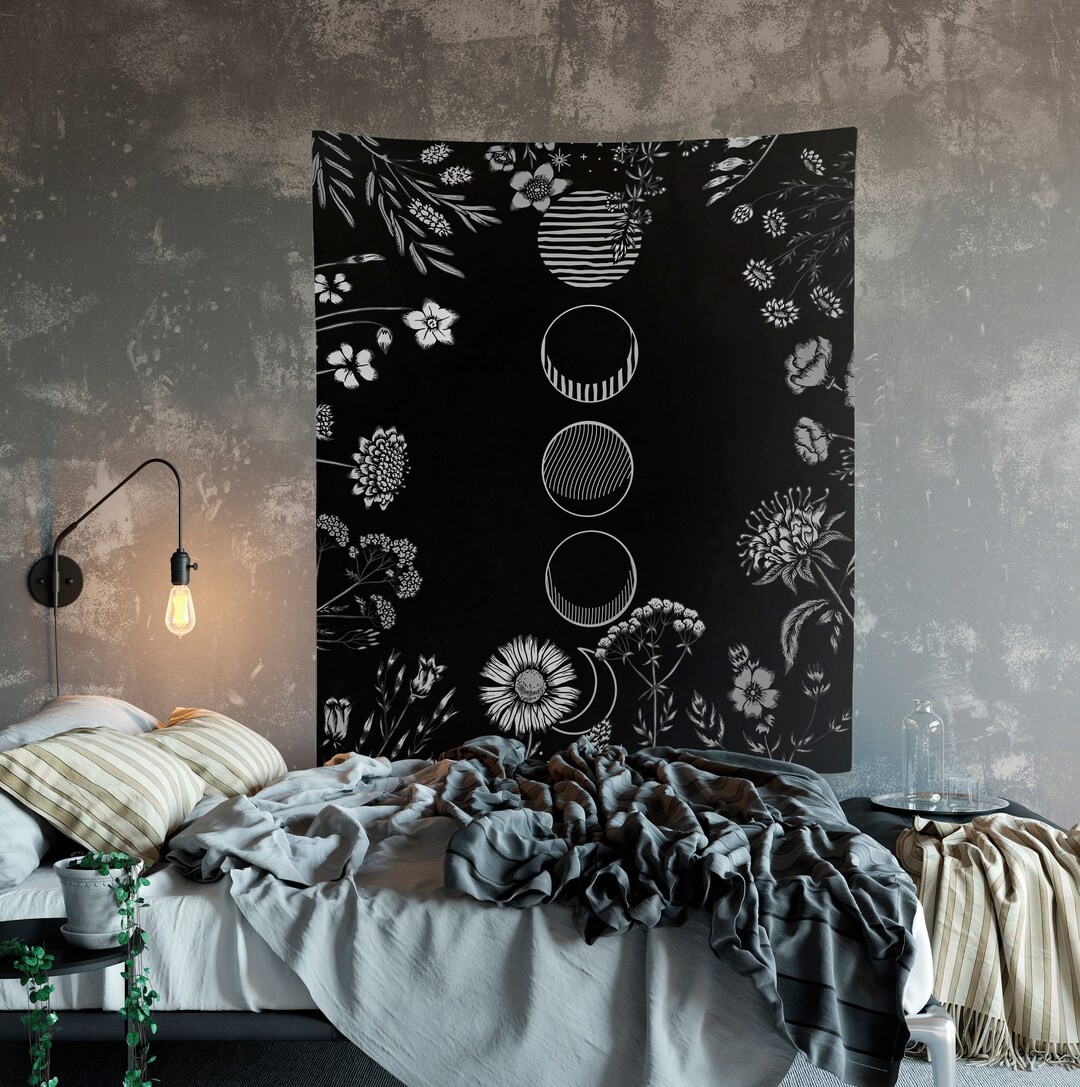 Moon Flowers Black White Tapestry Alchemy Gothic Meditation Hippie Wall Hanging by DesignBohemian