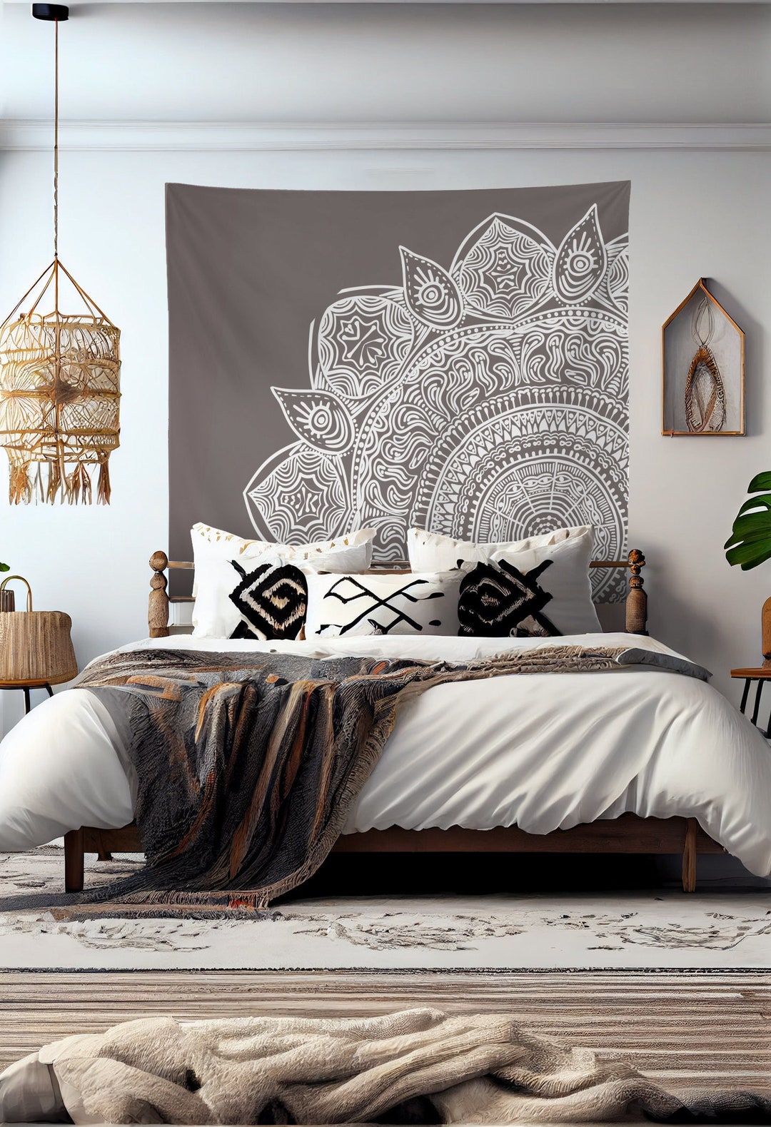 Beige White Mandala Wall Tapestry Yoga Meditation Mandala Wall Hanging Neutral by DesignBohemian