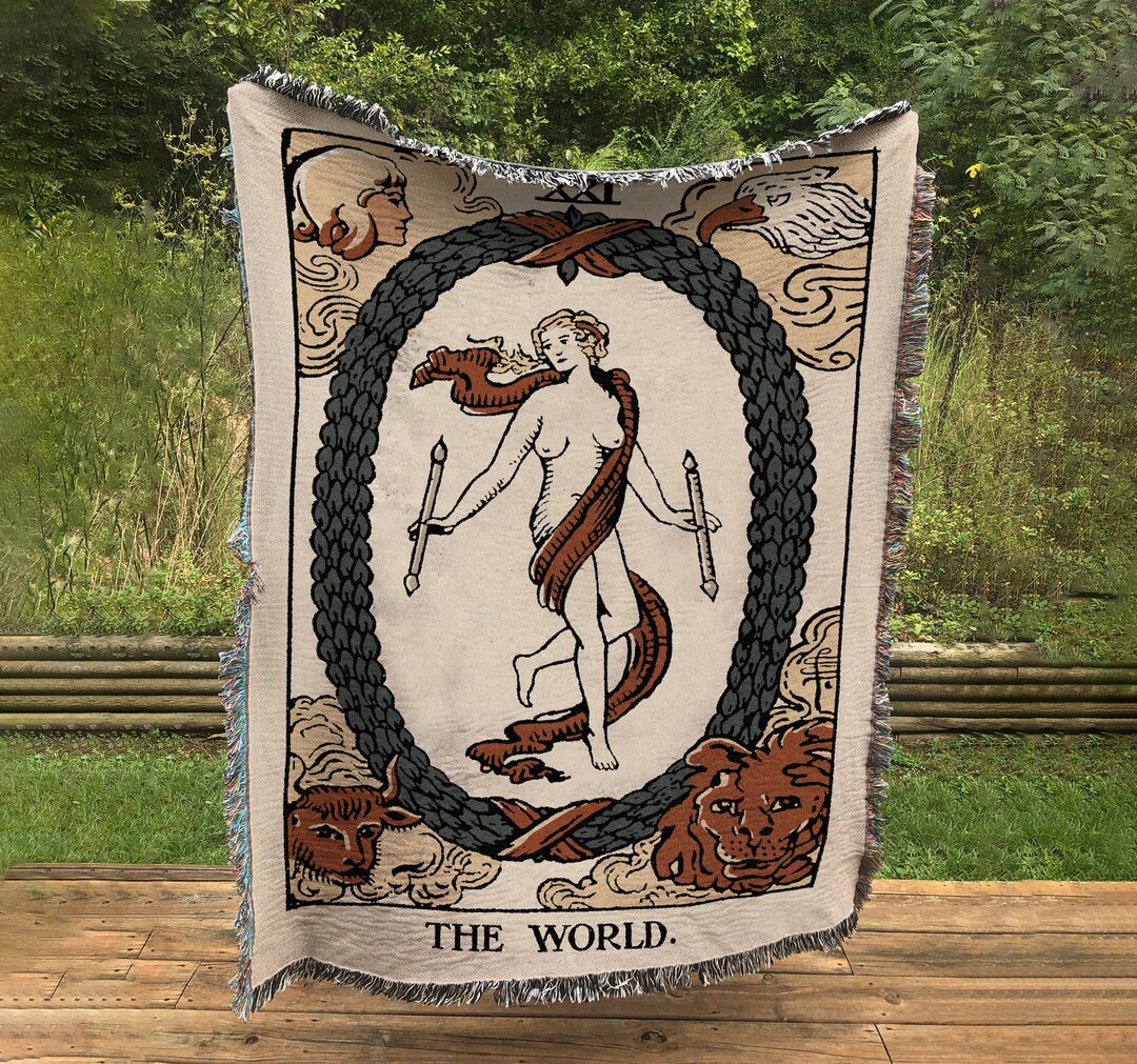 The World- Tarot Card Blanket- The World Card Natural Vibe Color Block Woven Throw Blanket Tapestry by Printagrams