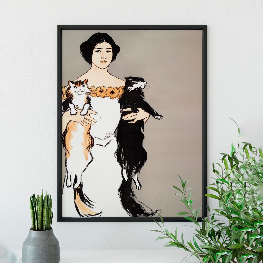 Vintage Cat Painting - Art Nouveau Woman and Cat illustration Print - Edward Penfield - Cat Lover - Portrait by DesignBohemian