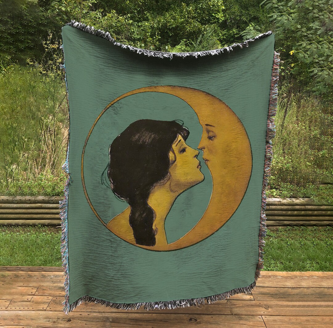 Woman Kissing Moon - Vintage Art Woven Moon Tapestry - Cotton Throw - Jacquard Woven by DesignBohemian