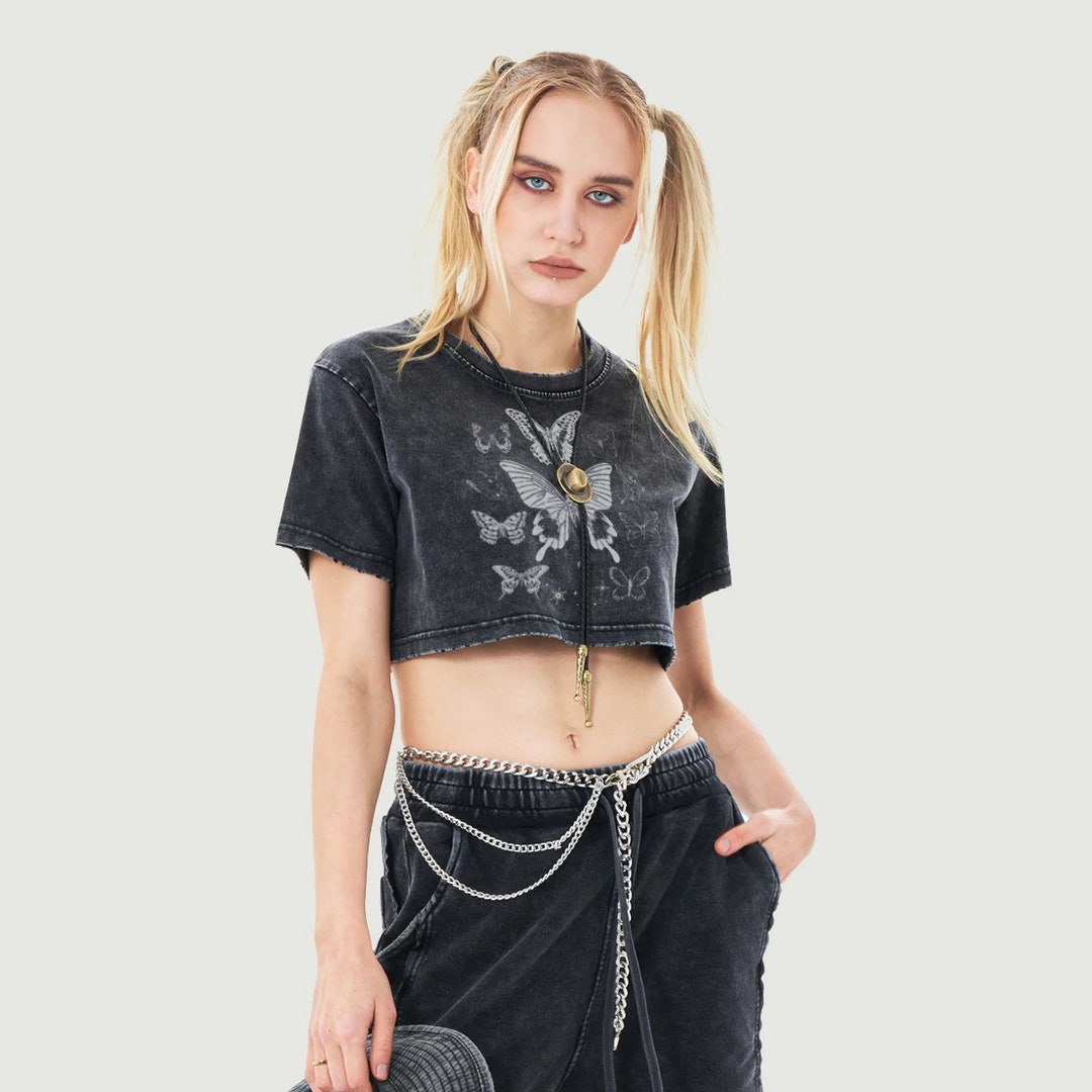 Butterfly Crop Top - Midriff Shirt - Black Crop Top - Women's Snow Wash Crop Top T-shirt by serenitygiftart