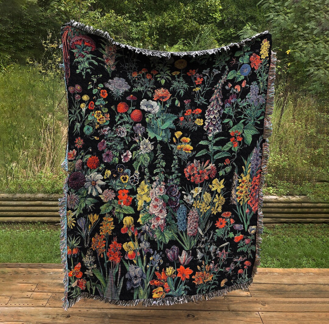 Adolphe Millot Woven - Black Background - Fleurs Floral Tapestry, Woven Flower Throw - Vintage Flower Bohemian Blanket - in Cotton by DesignBohemian