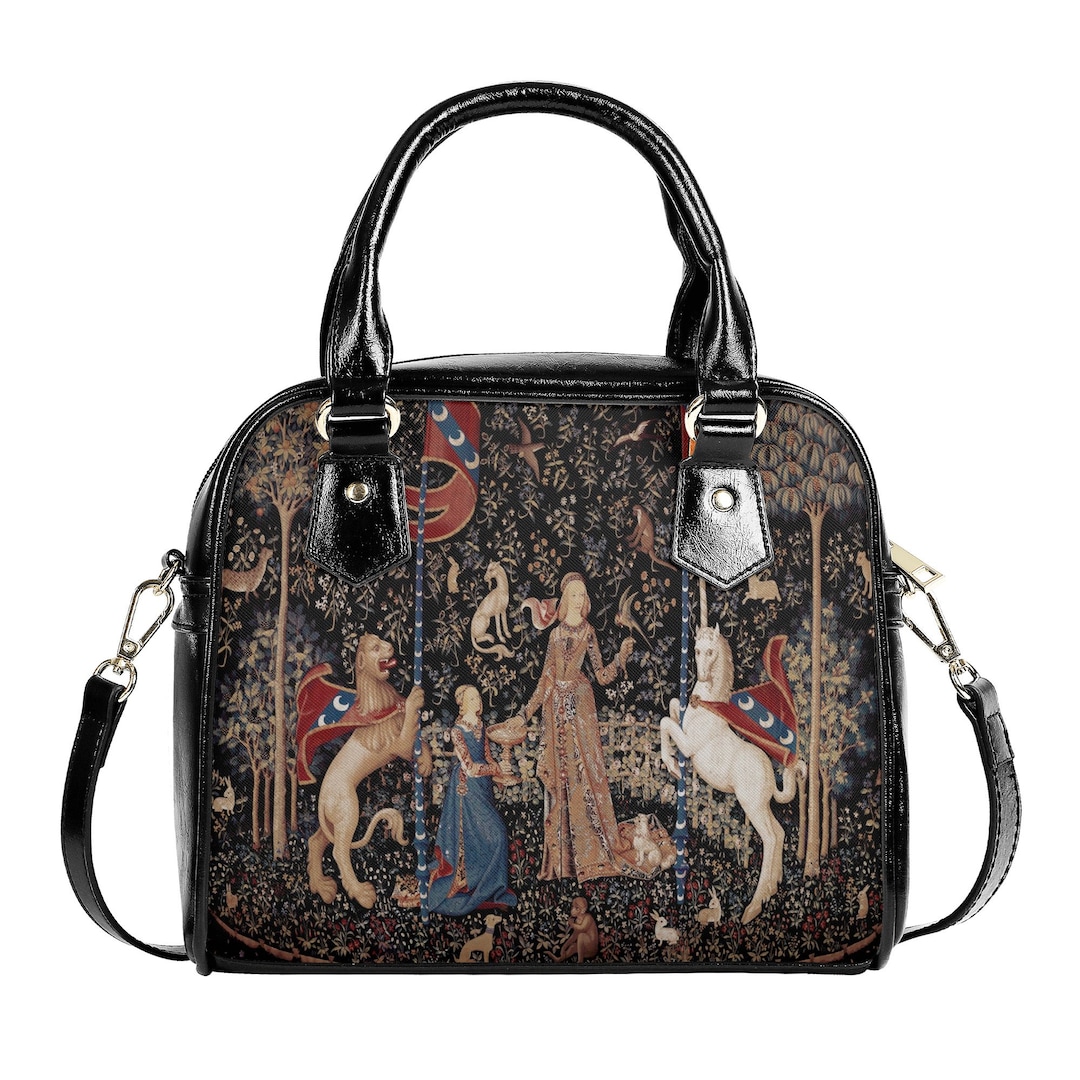 Introducing our Vintage Unicorn Top Handle Handbag – a captivating fusion of timeless elegance and mythical allure that beckons you into the enchanting realm of medieval art. Crafted to evoke the opulence of eras past, this handbag stands as a masterpiece, encapsulating the essence of medieval mystique and whimsical fantasy.