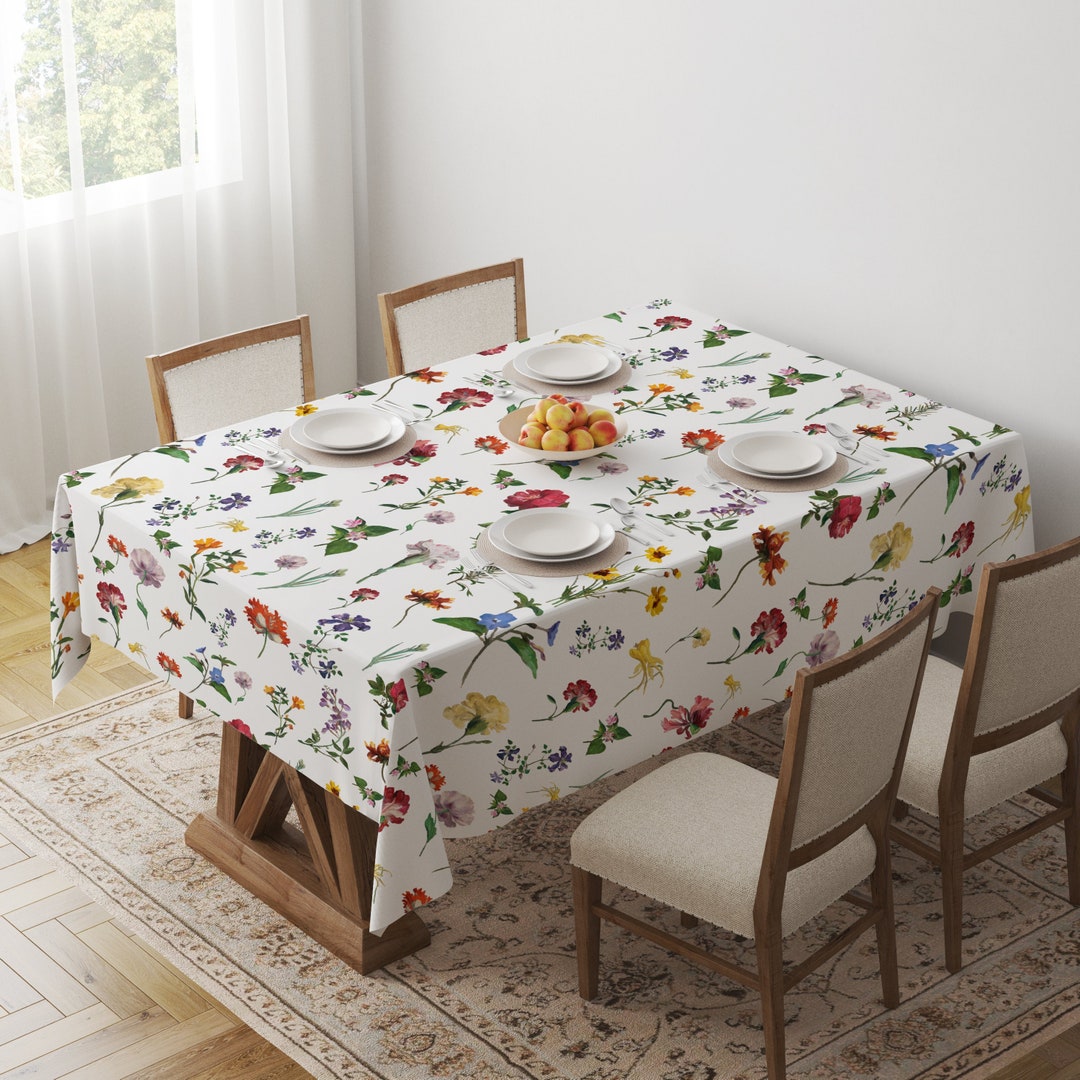 Tablecloths featuring summer floral designs, boasting impeccably finished edges. Available in both square and round shapes.