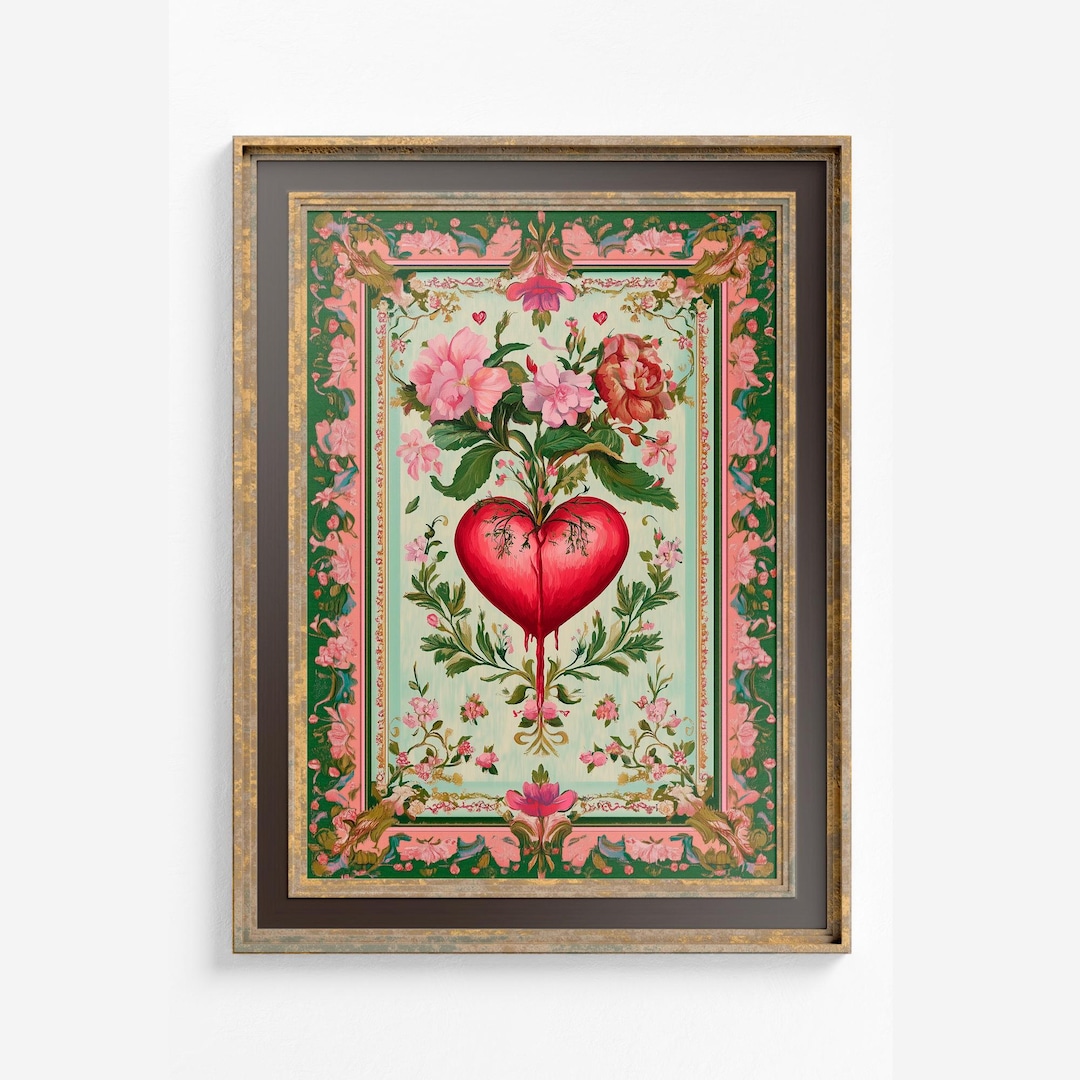 Vintage Immaculate Heart Art Print - Three of Swords Print - Floral - Home Wall Decor - Spiritual Art Painting - Vintage Green and Pink by DesignBohemian