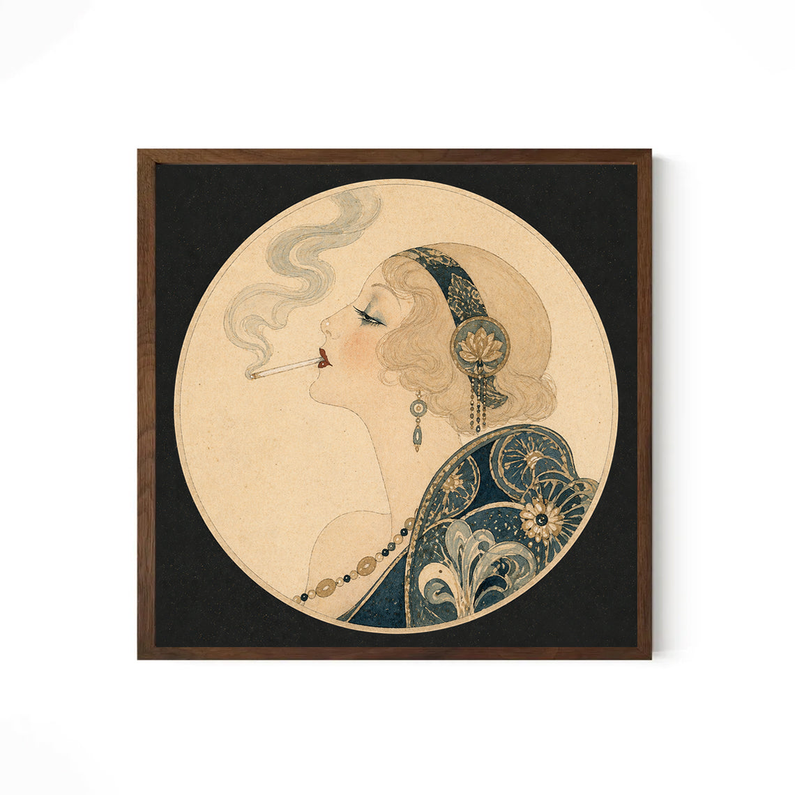 Drift into the understated elegance of 1920s Paris with this vintage-inspired flapper portrait, capturing a quiet, reflective moment suspended in time. Illustrated in a soft Art Nouveau style, the graceful profile of a woman and her delicate trail of smoke evoke both the allure and solitude of the Roaring Twenties.