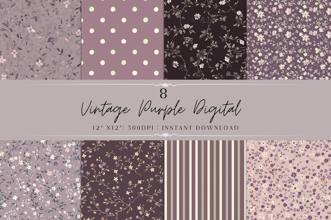 Vintage Floral Scrapbook Paper – 8 Purple Patterns (Digital Download)