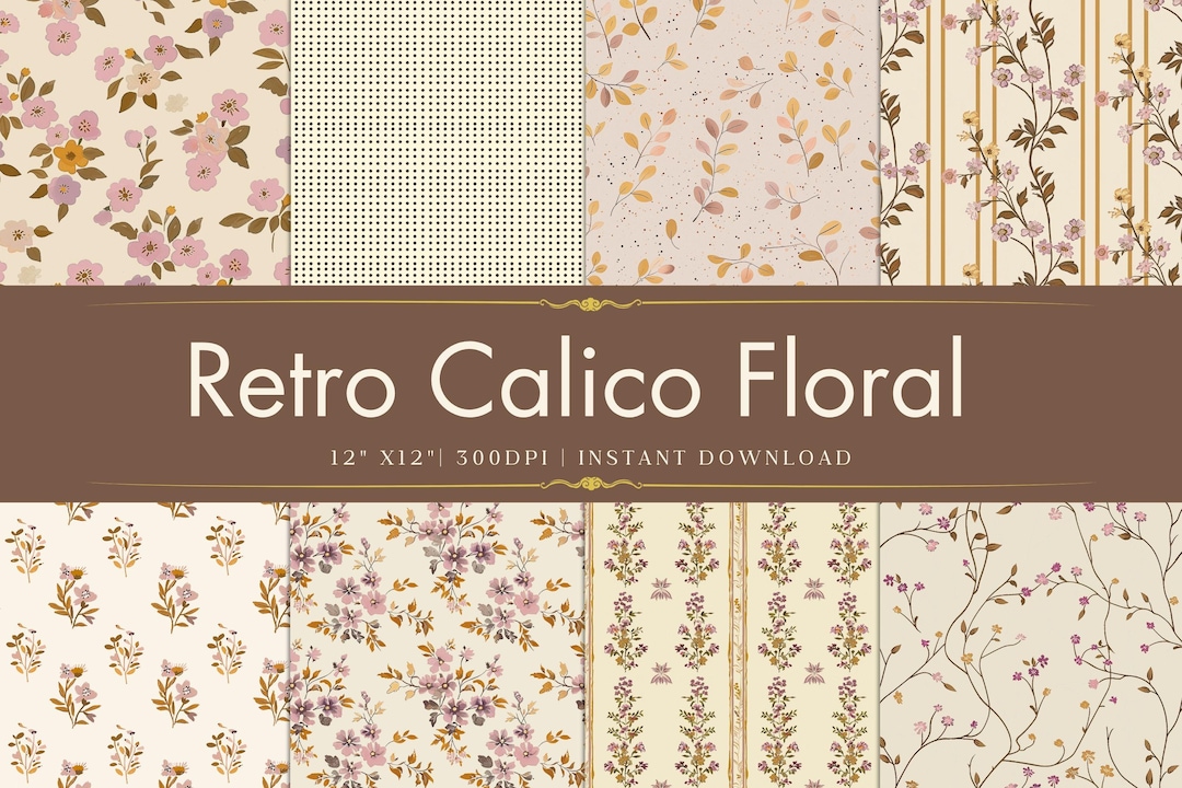 Vintage Floral Scrapbook Paper – Retro Beige Calico Flowers 8 (Digital Download) by DreamersPlan